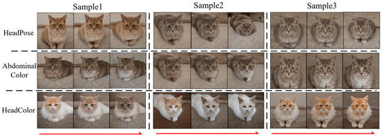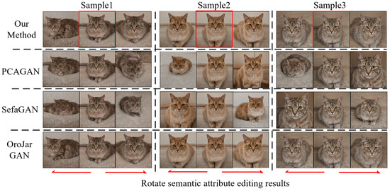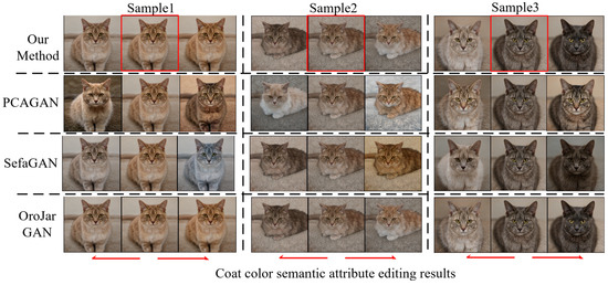 We evaluated four methods on the LSUNCat dataset in the same way, and the results are shown in Table 3. The disentangled performance of this method is similar to OroJaRGAN and better than PCAGAN and SefaGAN. We compared the results of semantic attribute editing for rotation and cat coat color, and the results are shown in Figure 12 and Figure 13. In both examples, PCAGAN and SefaGAN are more severely entangled with the cat poses in rotation semantic attributes, and more severely entangled with the global color in cat coat color, compared with these two methods in this paper. The editing effect of our method is significantly improved.