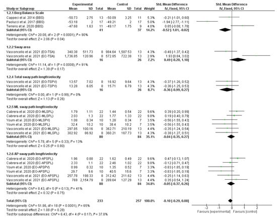 Figure 2 depicts the forest plot of the static balance meta-analysis. Due to the statistical heterogeneity of the results (I2 = 65%, p < 0.001), a statistical fixed effects model was applied. Patients’ static balance was not significantly improved in the EG in comparison with CG (SMD = −0.10, 95% CI = −0.29, 0.08; p = 0.28). However, significant differences were found in favour of EG in static balance measured by a subjective measure using the BBS (SMD = −0.52, 95% CI = −1.01, −0.02; p = 0.04).