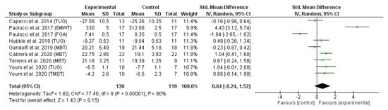 The results of the second meta-analysis (Figure 3) revealed the effect of trunk-specific exercises on dynamic balance measured using MBT [,,], 6MWT [], TUG [,,], FGA [] and TMST []. All studies that did not provide the necessary static or dynamic balance data to perform the meta-analysis (means and standard deviations) and for which no response was received from the authors were excluded.