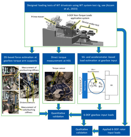 The proposed methodology for measuring the 6-DOF WT GB input loads during WT testing is developed and tested using signals from a purpose-designed sensor setup. Sensor data are collected during a measurement campaign on the 4MW WT system test bench at the CWD. Two widely deployed drivetrain configurations [32], 3- and 4-point drivetrain configurations based on the Vestas V52 WT drivetrain, were tested on the test bench during the campaign. The two drivetrains share the same GB, a GPV 306 by Bosch Rexroth. For more details on the design of experiments of the measurement campaign, see [14]. An overview of the methodology is provided in Figure 1. Section 2.1 describes the sensor setup and the implemented methodology to process the resulting signals to measure the GB 6-DOF input loads. Section 2.2 outlines the techniques utilized for validating said load measurements, while Section 2.3 explains considerations and challenges in the practical implementation of the proposed method.