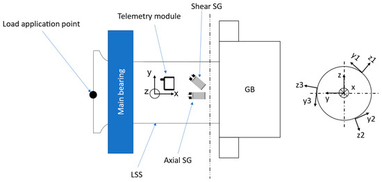 The aforementioned sensor data are collected from three identical sets of sensors, each installed equidistantly 120° apart along the circumference of the LSS. Figure 2 illustrates one such sensor set as mounted on the LSS, where the telemetry module contains a 3-dimensional (3D) accelerometer and transmits the collected signals from the adjacent strain gauge and the accelerometers to a receiver unit during drivetrain testing. As illustrated in the figure, each telemetry transmitter module is mounted on the surface of the LSS. Each module contains a 3D accelerometer with three axes oriented along the illustrated inertial COSs shown to the right of Figure 2. The accelerometer signals in the y- and z-directions are eventually used in post-processing to determine the angular position of each of the three sensor sets during LSS rotation. Apart from a telemetry module, each one of the abovementioned sensor sets includes two full bridge strain gauges (SG) applied on the LSS surface in parallel to the x-axis (hereinafter referred to as axial SG) and rotated 45° with respect to the x-axis (hereinafter referred to as shear SG), respectively, as illustrated in Figure 2.
