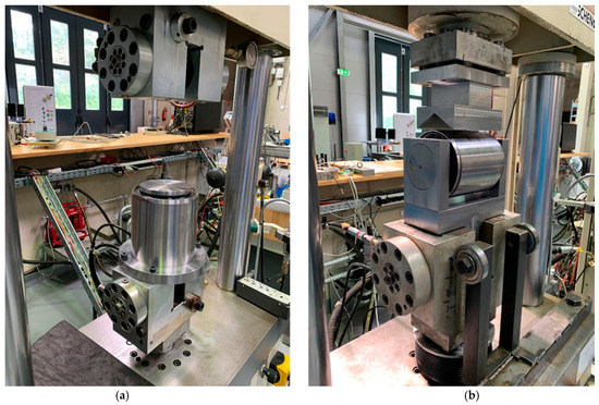 Since a solution for measuring 6-DOF GB input loads is not commercially available, sources of validation are limited. Furthermore, due to the design differences between the two tested drivetrains, the 4-point drivetrain non-torque GB input loads are expected to be minuscule compared to those of the three-point drivetrain [31]. Therefore, the methodology for the GB input loads estimation is first applied to a three-point drivetrain in this paper. Nevertheless, the proposed methodology is theoretically applicable to a 4-point drivetrain. Combining domain knowledge of the drivetrain design and knowledge of reference loads from different sensor data acquisition systems, a qualitative validation of the estimated GB input loads can be conducted. Therefore, the loads applied by the load application system of the 4 MW WT system test bench as well as a purposely designed set of DS aiming at measuring the deformation of the torque arm bushings are employed. For a more detailed explanation of the load application system of the test bench, see [18]. The aforementioned DS are applied to each of the left and right GB torque arms to measure their relative displacement with respect to the machine carrier in both the axial and vertical directions. In order to estimate the forces and from the abovementioned displacements, the stiffness of the torque arms bushings are estimated empirically. For the case of the three-point drivetrain, the axial and radial stiffness of the bushings supporting the GB torque arms is tested using a hydraulic press as shown in Figure 3a,b, respectively. In these tests, the bushings were repeatedly subjected to their rated loads, starting from an unloaded state with frequencies of 0.01, 0.1, and 1 Hz with the resulting deformation measured by the test bench shown in Figure 3. In the manner, the radial and axial stiffness of the bushings were empirically estimated.