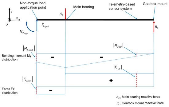 According to the internal loads theory, the internal loads at the GB input, i.e., the estimated GB input loads (see Section 2.1), are the result of the applied loads [36]. Due to the main bearing arrangement, the non-torque GB input loads differ from the non-torque loads applied by the test bench as illustrated by the red dash-lined loads shown in the exemplary load distribution in Figure 4.