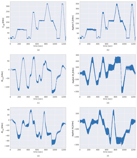 For the validation of the 6-DOF gearbox input loads, a test scenario with multiple applied loads is employed. This multiple-load test scenario is based on the quasi-statistical design of accelerated load testing as developed by Azzam et al. in [29]. The 3-DOF moments , and applied by the aforementioned load application system are shown side-by-side to the 3-DOF GB input loads , and estimated in the abovementioned multiple-load test scenario are shown in Figure 9.