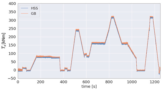The GB input torque estimated according to the methodology outlined in Section 2.1 is shown side by side with the applied torque in Figure 9a,b, respectively. The GB input bending moment computed according to the methodology outlined in Section 2.1 and the applied bending moment are shown in Figure 9c,d, respectively, for comparison. In addition, Figure 10 can be used to compare the estimated torque using the proposed method () to the directly measured torque at the HSS (). For a more quantitative comparison between the two variables shown in the figure, the R2 score is above 0.99.