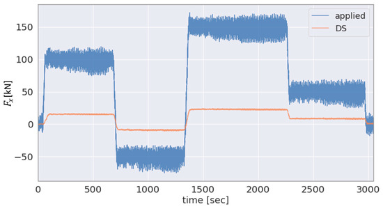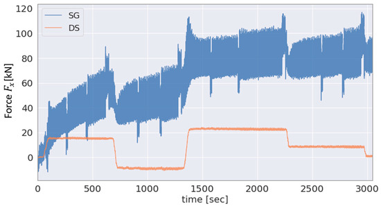 To select the most effective approach for the estimation of the GB input axial force from among the different solutions (see Section 2.3), the axial force based on the different sensor data is provided in Figure 11 and Figure 12. Figure 11 shows the applied and DS-based axial force and Figure 12 the SG-based GB input axial force and the DS-based axial force in the single-load test scenario for the force .