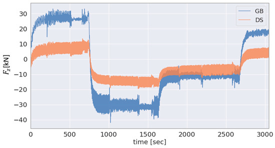 Moreover, in the case the SG-based GB input forces and are not well conditioned, an alternative, hybrid method is proposed in which a scale correction is performed in a single-load test scenario for the drivetrain input force in the z-direction using the DS-based approach for the . In addition, if high-frequency noise remains in said forces, these can be filtered using a Savitzky-Golay filter [38]. Therefore, the window length of 2001 sample points at a general sampling rate of f = 500 Hz and a polynomial order of 3 can be chosen as filter parameters.