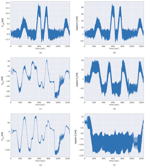 Comparison between estimated GB input forces and applied forces. The panels (a–f) show the GB input forces , and and applied forces , and , respectively, in a multiple-load test scenario as indicated by the labels of the respective axes.