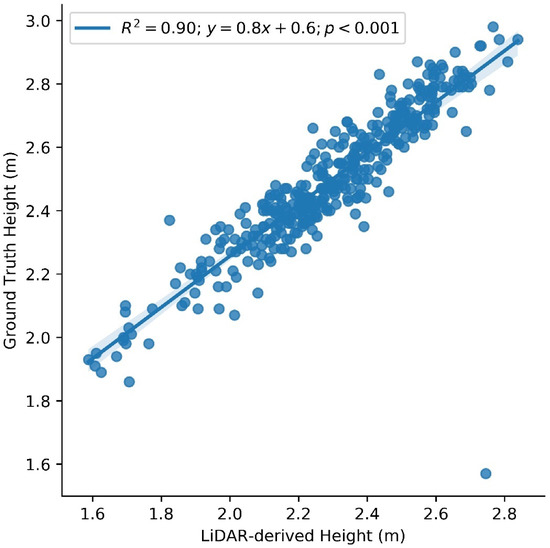 Scatter plot between LiDAR-derived (remotely captured in R5 stage) and ground truth height (measured in R6 stage) in meters.
