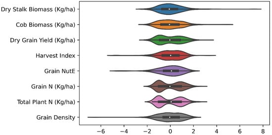 Standardized form of ground-truth data of eight maize phenotypes collected during the growing season. The means of all phenotypes after rescaling the distribution values were 0 and standard deviations were 1. Dry grain yield, grain nitrogen content, total plant nitrogen content displayed a binomial data distribution with no extreme instances. The other distributions looked normal but contained extreme values in their datasets.