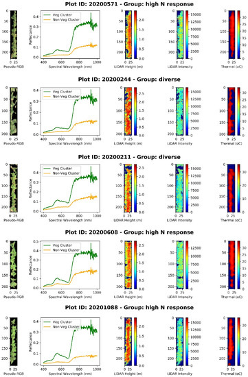 The segmentation results of 5 random plots using k-means clustering to extract pure vegetation pixels (Areas of interest, AOIs) from non-vegetation pixels (soil, crop residuals, heavy shadow, etc.). The segmentation was done on weed-free sample plots instead of the ortho-mosaic image of the entire field that possibly contained weeds. The hyperspectral profiles of pure vegetation were again verified and affirmed with LiDAR height and intensity, and thermal.