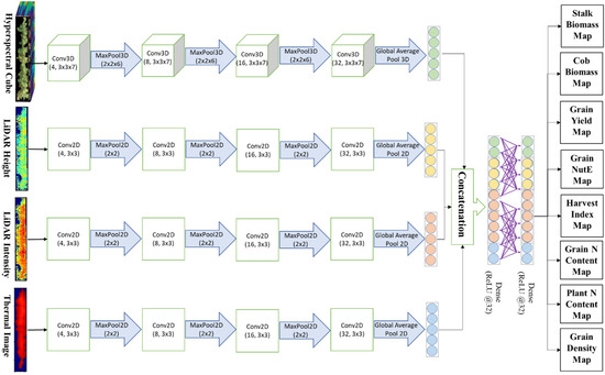 It is ideal if those above-discussed data sources become intermingled by some means of data fusion that then benefit crop estimations at a higher accuracy. Several recent studies proved this pathway at a certain confidence level in classifying forest tree species [48,49], detecting pine wilt disease [50], and estimating crops’ traits such as grain yield [5] and seed compositions [51]. Among these works, very few exploited the full potential of deep learning and convolutional neural networks, in particular, for aerial multisensory data fusion. Adding to the further side of a more accurate multimodal fusion model, a multi-task deep learning model consuming multiple data modalities to predict multiple crop phenotypes simultaneously is strongly desired to surpass and has not even existed in the literature.