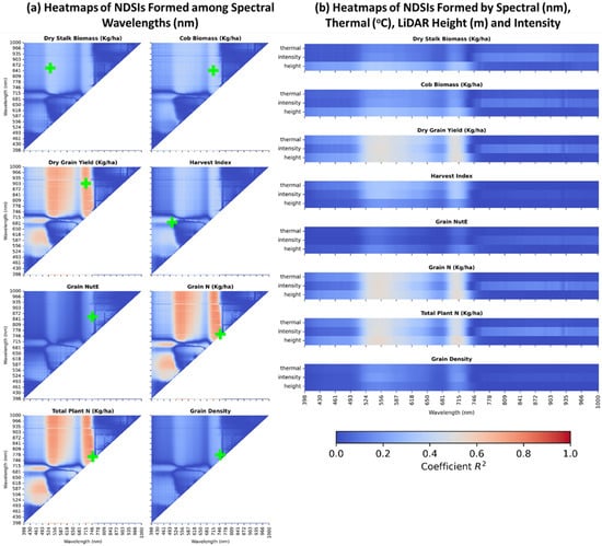 Extended NDSI correlation heatmaps. Each NDSI was established by combining and normalizing two 269 singular spectral bands (398 nm–1000 nm) (a), and fused features from spectra, LiDAR canopy height, LiDAR canopy intensity, and canopy thermal data (b). The lime-colored cross signs indicated the best R2 for each maize trait. In detail, Dry Stalk Biomass achieved a maximum R2 = 0.357 with NDSI[534, 868]. Cob Biomass optimally gained R2 = 0.384 at NDSI[715, 855]. Dry Grain Yield had the highest R2 = 0.746 at NDSI[715, 917]. Harvest Index received the highest R2 = 0.451 at NDSI[504, 700]. Grain Nitrogen Utilization Efficiency (NutE) attained R2 = 0.271 at NDSI[749, 866]. Grain Nitrogen Content (Grain N) reached R2 = 0.796 at NDSI[751, 769]. Total Plant Nitrogen Content (Total Plant N) had the peak of R2 = 0.80 at NDSI[751, 778]. Grain Density ran into R2 = 0.276 at NDSI[751, 789].