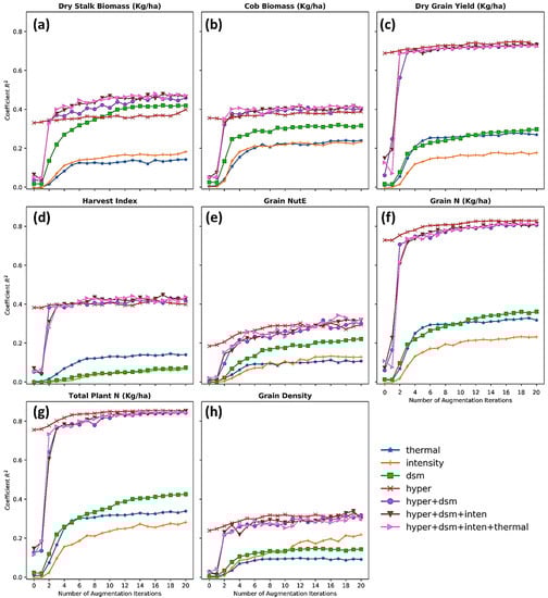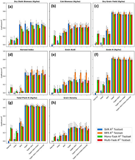 Figure 8 demonstrates the mean and standard deviation of coefficient R2 performed on a 5-time bootstrap using four different regressors and a variety of multi-sensory data fusions. The following common points can be noticed from Figure 6, and more details (R2, RMSE, MAE of both train and test sets) can be accessed in Appendix B. First, the prediction success highly varied from phenotype to phenotype, possibly dividing into a limited (R2 < 0.5), moderate (0.5 < R2 < 0.8), and high level (R2 > 0.8). Predictions of dry grain yield (R2 = 0.78), grain nitrogen content (R2 = 0.85), and total plant nitrogen content (R2 = 0.85) were reported as the highest degree of success. Although different studies employed different methods and data available, this study’s results were somewhat better to recent studies of maize yield prediction (R2 varied 0.3–0.8 depending on growing stages) [104,105,106], total Nitrogen content (R2 = 0.76) [107].