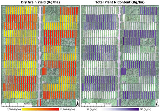 Spatial distribution maps of predicted dry grain yield (kg/ha) and total plant nitrogen content (kg/ha) which were the results of the multimodal and multi-task deep learning model.
