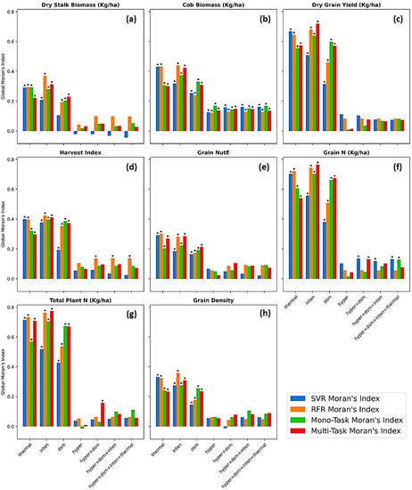 Further, a spatial variability of the prediction results was statistically evaluated, particularly by Global Moran’s I (GMI). The GMI measures the spatial autocorrelation contingent on the maize plot locations and the model’s regression errors over the study area [5,103]. The errors were residuals between the measured and predicted phenotypes of each maize plot. The GMI’s null hypothesis states that the phenotypes’ predicted errors are complete spatial randomness or randomly distributed.