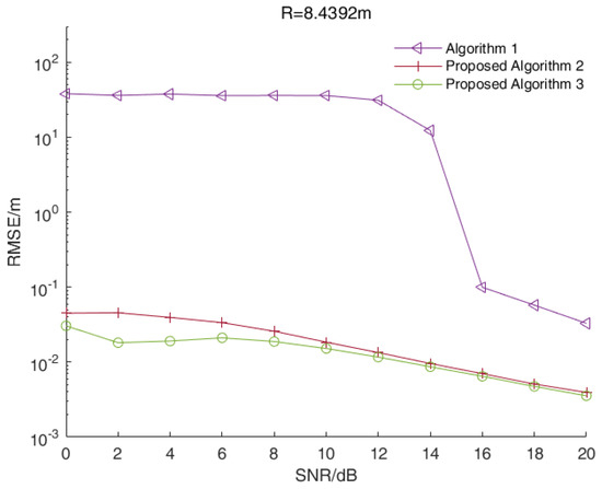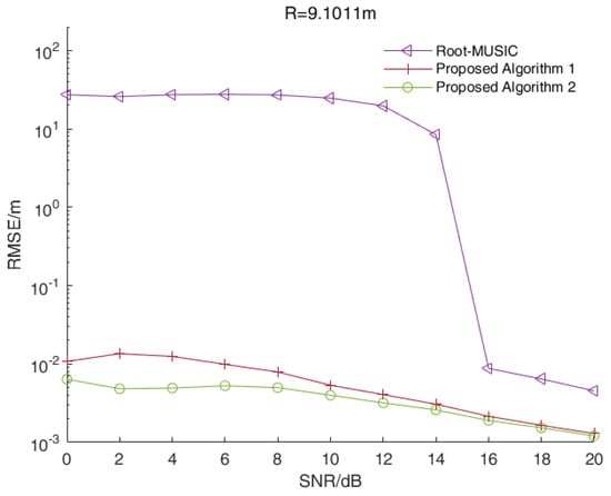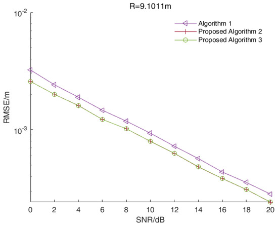In this simulation, we assumed that there were three targets that needed to be measured at the same time. The distances between the targets and the radar were 8.4392 m, 8.6047 m and 9.1011 m while the corresponding frequencies were 5100 Hz, 5200 Hz and 5500 Hz, respectively. Figure 7 shows the RMSE values of the distance estimations versus the SNR values of the various algorithms when m. Figure 8 and Figure 9 show the corresponding results when m and m, respectively.