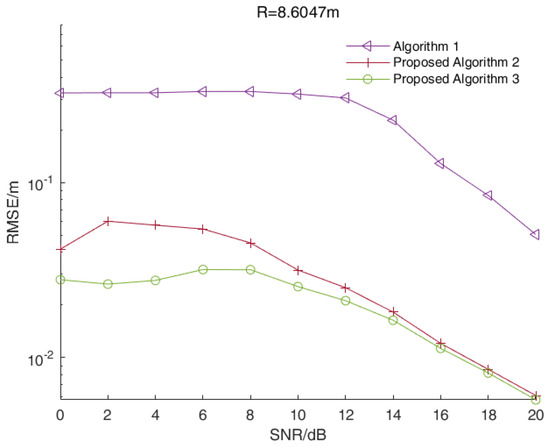 In a multi-target scenario, we assumed that the distances between the target and the radar were 8.4392 m, 8.6047 m and 9.1011 m, while the signal beat frequency was 5100 Hz, 5200 Hz and 5500 Hz, respectively. Figure 3 shows the RMSE values of distance estimations versus the SNR values of all three algorithms when m. Figure 4 and Figure 5 show the corresponding results when m and m, respectively.