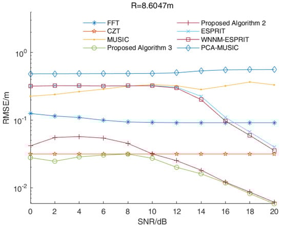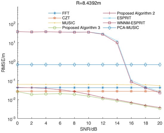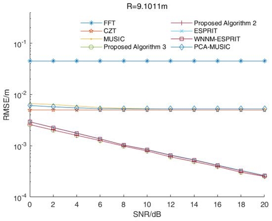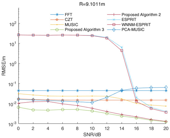 As shown in Figure 7 and Figure 8, the RMSE values of the MUSIC algorithm, the ESPRIT algorithm and their improved algorithms were larger than other algorithms under low SNR values. Since these were affected by the noise, there were large errors in the estimations of the signal subspace and the noise subspace, which meant it could not distinguish close frequencies. Similar to a single-target scenario, the RMSE values of the distance estimations of the FFT algorithm and the CZT algorithm were stable. As shown in Figure 7 and Figure 8, the performance of proposed Algorithm 2 was better than the CZT algorithm when the SNR value was larger than 10 dB. In Figure 9, the RMSE value of proposed Algorithm 2 was smaller than that of the CZT algorithm. Overall, the proposed algorithms (Algorithms 2 and 3) and the CZT algorithm had better performances. However, the CZT algorithm still had the problem of the fence effect, so its performance was not improved when as the SNR values increased. The proposed algorithms (Algorithms 2 and 3) had the problem of high computational complexity, which indicated they could not be applied in real-time applications. For a scenario with a high range accuracy, proposed Algorithm 3 was the best choice. The RMSE values of the distance estimations by proposed Algorithm 3 were the smallest under different SNR values, which indicated proposed Algorithm 3 could estimate close frequencies effectively.