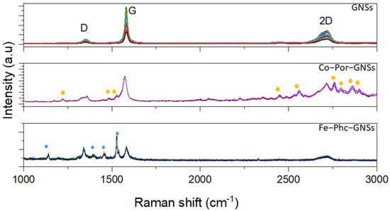 Micro-Raman spectroscopy was used to characterize the defect densities of GNSs and functionalized GNSs. Further, Raman spectroscopy is a powerful tool to use to investigate electron transfer interactions between the GNSs and MPor and MPhc. All Raman spectra were recorded at the excitation wavelength of 532 nm under ambient conditions (laser spot size is 0.2 µm on the sample). The data were obtained using minimum power in order to prevent laser heating. Both GNSs and functionalized GNSs showed three typical peaks assigned as D, G, and 2D peaks observed at around 1353, 1581, and 2716 cm−1, respectively (Figure 1), which are consistent with previous studies [36]. The D band at 1353 cm−1 originates from structural defects, which may arise from certain defects such as vacancies, grain boundaries, and amorphous carbon species [37]. The G band at around 1581 cm−1 is attributed to the first-order diffusion of the E2g mode, and the 2D band at 2716 cm−1 is the most important band confirming the presence of graphene in the structure and attributed to the two-phonon double resonance process indicator of the number of graphene layers [38]. The fitting 2D band enables one to determine the number of layers [36]. Zhou et al. [39] attributed the peaks at ~2707 cm−1 and ~2732 cm−1 to a few and multilayer graphene sheets. In addition, the 2D band is broadened which may be due to the fact that the shear-assisted LPE GNSs contain a few layers with some defects. Moreover, the observed weak D band indicates high-quality graphene with the presence of few defects in the crystalline structure. In the Raman spectra of functionalized GNSs (Co-Por-GNS and Fe-Phc-GNSs), new peaks appear which are assigned to the physi-adsorbed molecules. The intensity ratio of the D and G peaks (I(D)/I(G)), usually used to provide quantitative metrics of the defect densities of graphitic materials, was found to be 0.21, 0.23, and 0.19 for pristine GNSs, Co-Por-GNSs, and Fe-Phc-GNSs, respectively. The I(D)/I(G) defect ratio found for pristine GNSs (0.21) is much lower than the defect ratio of 0.43 previously reported using the sonication method [40]. As shown in Figure 1, the D and G peak intensities were almost unchanged after functionalization, thus confirming that the functionalization does not destroy the extended π-conjugation system of the GNSs [41]. The position of the G band is sensitive to the functionalization of GNSs with Co-Por and Fe-Phc. Indeed, the G band of Co-Por-GNSs appears at 1573 cm−1 which is downshifted by 8 cm−1 compared to that of GNSs at 1581 cm−1, a clear indication of molecular doping with Co-Por molecules, which induce n-type doping, e.g., an increasing electron concentration in pristine GNSs. On the contrary, the G band of Fe-Phc-GNSs observed at 1583 cm−1 is upshifted which suggests p-type doping caused by Fe-Phc molecules, e.g., a decreasing electron concentration in the GNSs. These observations are in agreement with our previous report on interfacial charge transfer interactions, via π-π interactions, between CVD-graphene and Fe-Phc and Co-Por [35].