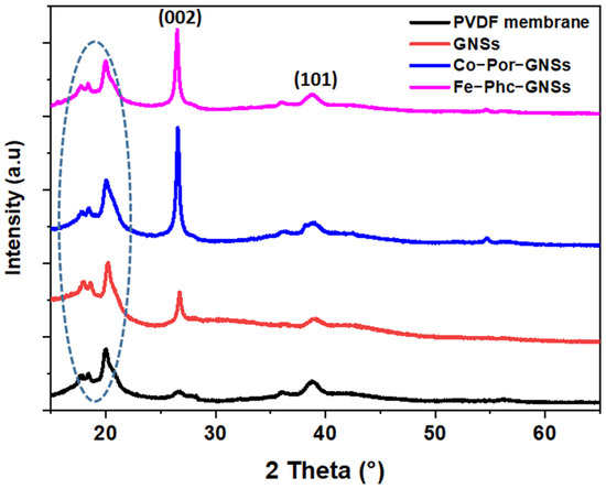 X-ray diffraction (XRD) was utilized to confirm the crystallinity of the shear-assisted LPE of GNSs. The XRD patterns of GNSs and functionalized GNSs with Co-Por and Fe-Phc recorded in the range of 2θ from 15° to 65° are presented in Figure 2. The XRD patterns show the presence of a strong sharp diffraction peak located at 2θ = 26.6° (002) with an interlayer distance of 0.33 nm, determined using Bragg’s law equation [42,43]. Besides this peak, one peak appeared at 2θ = 39° and was assigned to a short-range order in stacked graphene layers (101) [42,43]. The polyvinylidene fluoride (PVDF) membrane has peaks at around 2θ angles of 18.4 and 20.2 at planes (100) and (021) (marked by circle in Figure 2). After functionalization, no effect was observed on the XRD patterns which allows us to conclude that neither Co-Por nor Fe-Phc affect the crystalline structure of GNSs [44].