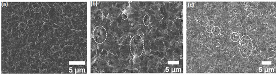 SEM images of (a) pristine GNSs, (b) functionalized GNSs with Co-Por, and (c) functionalized GNSs with Fe-Phc. The observed aggregates on functionalized surface are marked by circles.
