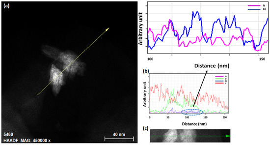 STEM-HAADF-EDS line scan analyses of Co-Por functionalized GNSs: (a) STEM-HAADF micrograph on the chosen area where a line scan along the direction indicated by the yellow arrow was performed. (b) Corresponding STEM-EDS line scan spectrum showing the variation of the Nitrogen (in pink), Cobalt (in blue), Carbon (in red), and oxygen (in green) signal recorded along the scanning direction indicated by the green arrow in (c). (c) Zoom of the analyzed area indicated by the yellow arrow in (a).