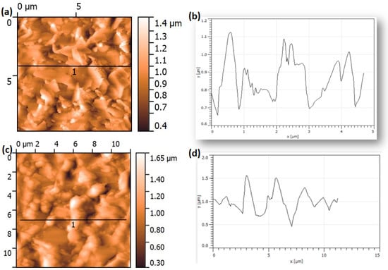 The morphology of pristine GNSs was further investigated by AFM; the results are shown in Figure 6 and Figure S9. The AFM images show a clear stacked structure composed of connected GNSs. The height profile of the AFM image (Figure 6a) indicated that the surface roughness of the nanosheet network thin film is estimated to be around 0.1–1.5 µm, suggesting the presence of multilayer graphene. AFM morphology and surface roughness do not change much upon functionalization (Figure 6c,d); only the height was slightly increased.