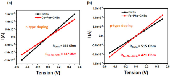 I versus V curves of GNSs and functionalized GNSs with Co-Por and Fe-Phc: (a) GNSs and Co-Por-GNSs; (b) GNSs and Fe-Phc-GNSs.