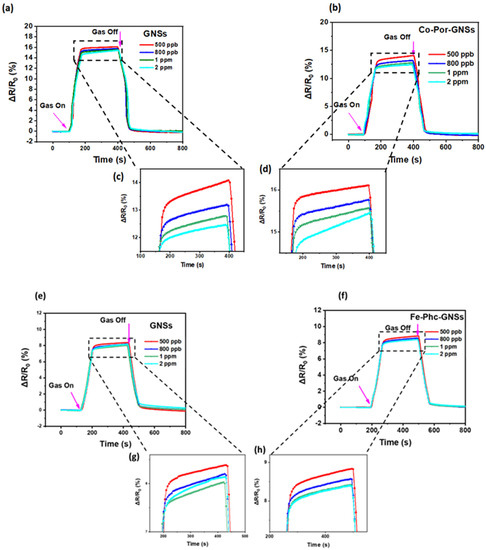 Nitrogen dioxide (NO2) toxic gas, emitted primarily from fossil fuel combustion, automobiles, and industry, is harmful to human health and the environment. Therefore, there is a growing need for developing gas sensors operating at room temperature and detecting NO2 gas both qualitatively and quantitatively [16,17,45]. To demonstrate the utility of these functionalized GNSs as chemiresistive sensors, both pristine and functionalized thin-film networks of GNSs were exposed to NO2 gas at room temperature (30 ± r is composed of a 100 cm3 box made of stainless steel and equipped with a precision humidity control system (1–97% RH and 0.01 resolution) and a temperature control system (20–200 °C) attached from outside to the chamber. As previously demonstrated, heating accelerates the desorption process and quick recovery of the sensor, through vibrationally exciting molecules and then repulsing them from the surface [16]. A known volume of NO2 is injected into the chamber and then diluted with dry N2 to fill up the volume of the chamber. The NO2 vapor concentration is calculated by using the following formula: