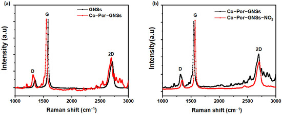 Raman spectra of GNSs and Co-Por-GNSs before (a) and after (b) detection of NO2 (λexc = 532 nm).