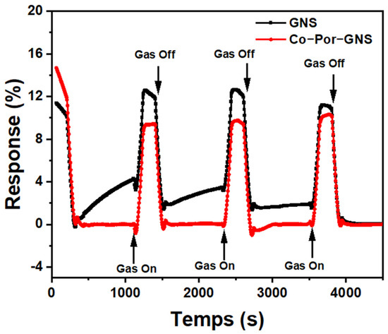 Figure 10 shows a real-time response of the two devices Co-Por-GNSs and GNSs when subjected to various absorption/desorption cycles of NO2 at 1 ppm concentration to evaluate repeatability. As evidenced by this figure, the functionalized GNS-based gas sensor exhibits a high-reproducibility characteristic during a long time in this condition without any significant drift after turning off the NO2 and purging the chamber with N2. Thus, the functionalized GNS sensor was shown to possess good repeatability and reversibility, demonstrating relatively fast and stable on/off switching in each cycle. Furthermore, even after several months, the functionalized GNS sensors still show excellent sensing performance, which suggests that these sensors have great potential in the sensing area.