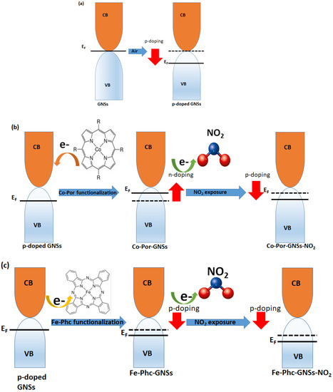 In ambient conditions, the GNS is p-doped due to stabilized anions (O2−) available on its surface. They will receive electrons from the GNS valence band [47], which induce its hole doping (Figure 11a). In our previous work, we reported that graphene is p-doped by functionalization with Fe-Phc and n-type doped with Co-Por [35]. Indeed, the chemical modification of GNSs with Co-Por causes a charge transfer between Co atom d-electrons and GNSs’ π-electrons; as a result, there is an increase in the electron concentration (n-type doping), and the Fermi level shifts toward the conductance band (Figure 11b). When NO2 molecules are adsorbed on the Co-GNS surface, they act as electron acceptors (the adsorption of NO2 on n-doped graphene can be facilitated between electron-deficient NO2 and electron-rich graphene). Therefore, they extract electrons from Co-Por-GNSs, hence the shift in the GNSs’ Fermi level toward the valence band (Figure 11b). Meanwhile, the adsorption of Fe-Phc on the GNS surface induces a charge transfer from GNSs to Fe-Phc thus indicating p-type doping. Upon exposure to NO2 molecules, the latter are adsorbed on the Fe-Phc-GNS surface, and an electron transfer from Fe-Phc to NO2 occurs resulting in an increase in hole density, and as a result, the Fermi level shifts more toward the valance band (Figure 11c).