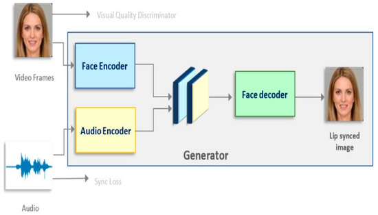 We used the Wave2Lip model proposed by Prajwal et al. [25] for the GAN data augmentation. The generator takes two parts of the model input, a sequence of video frames and an audio (melspectrogram segment) and fuses the features and generates frames that synchronize the lips with the audio. The architecture used two discriminators: (1) a discriminator to determine whether the generated lip image was synchronized with the audio; and (2) a discriminator to receive the lip image generated by the generator and the lip image synchronized with the audio to determine its authenticity and to produce better lip quality.