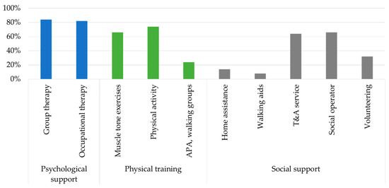 Significant percentage values (Figure 4) were recorded for psychological support in both group therapy (84%) and occupational therapy (82%). This highlights the need for an intervention in response to a widespread critical depressive status among the elderly. Therefore, many of them were prompted to improve their physical activity (74%) by performing regular training. In particular, those with risk or confirmed sarcopenia were indicated for muscle tone exercises (66%) that can increase muscle mass and reduce muscle weakness. High scores were also obtained in transportation and accompaniment (64%) services and social worker (66%) service, conceived as a person who keeps the elderly company and offers entertainment activities.