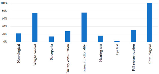 The most needed visits (Figure 5) were cardiological (100%), renal functionality examination (76%), and weight control (74%). The cardiological visit results were assigned to the whole target population. Even if patients do not report any precedent cardiac event or chronic renal insufficiency (CRI), almost everybody presented at least one cardiovascular risk factor (i.e., smoking, diabetes, familiarity, hypercholesterolemia, or obesity). Not negligible is the fall reconstruction visit (30%), assigned to those classified as low fall risk according to the quantitative scales but who have experienced single or frequent falls in the recent past that merit consideration.