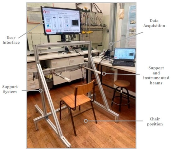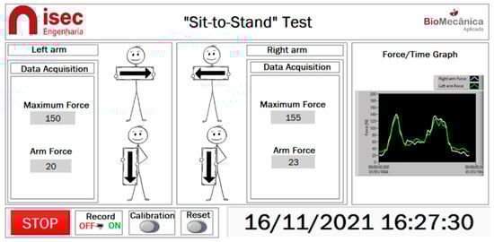 The system incorporated a National Instruments chassis (NI-cDAQ-9174) and two data board acquisitions (NI 9219), ensuring a total of eight channels necessary to connect all the strain gauges (each one in a quarter bridge). The acquisition of the signal from the strain gauges was carried out through the LabView software. Two applications were developed in this software, one for the system’s calibration and another for the user interface to the system and data recording during the use of the biomechanical system in the STS movement. The application allowed for recording the applied force over time, the visualization of the maximum applied force by each arm, and the resultant force’s direction. The force-time can also be visualized in real-time. Figure 1 shows the interface with the user. The forces applied by each arm were recorded in an Excel file for post-processing.