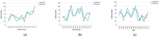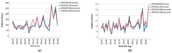 Figure 4 shows a relation between the weight of the volunteers and the average of the forces measured in tests performed, and a relation between the volunteers’ height and the maximum mean of the forces measured in the tests performed. In both situations, it can be observed that as the weight and the height increased, the peaks of the maximum of the applied forces also increased, which was expected.