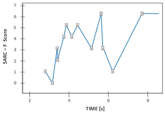 Figure 5 shows a relation between the maximum mean of the forces applied in the tests and the volunteers’ height, being able to identify an increasing trend. In other words, as the height increased, the maximum mean forces also increased. Figure 5 also shows a decreasing trend that can be seen between the mass of the volunteer and their body mass index—BMI concerning the strength, i.e., as the weight and the BMI increased, the applied force decreased. Figure 6 shows a relation between the SARC-F score and the time taken to perform the movement. As the SCARC-F increased, volunteers’ time to make the STS movement increased, although some outliers can be identified. Since sarcopenia is the loss of muscle mass and it is classified by score, i.e., the higher the score, the more predictive of having sarcopenia, it was expected that the volunteers with a superior score would take longer to make the STS movement.
