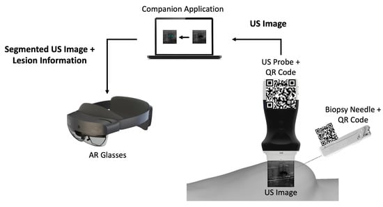 Overall, the current work introduces two novelties. The first is a new AR-assisted ultrasound breast biopsy system with embedded AI for lesions in ultrasound imaging, consequently allowing real-time detection and localization of possible lesions in the three-dimensional world of the AR glasses. The second novelty is the assistance for the biopsy needle alignment, which helps the user to position the needle at the correct alignment so that it shows in the generated US image.