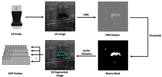 The workflow of the companion application starts with the reception of a new US image frame from the US probe. This image has 512 × 512 pixels, dimensions manually set in the probe’s API. These dimensions were chosen so that the image would have the correct size to be used as input by the CNN model. The network architecture was U-Net, which performs well in tumor segmentation [28], based on the work developed with automatic lesion segmentation in breast cancer applications specialized in breast US images [29,30]. The incoming US image is converted, using the OpenCV library, from a 3-channel RGB image to a single-channel grayscale image before being passed to the network, which expects a 512 by 512-pixel wide grayscale image. The network’s output is a grayscale image the same size as the input that highlights what it considers to be lesions. Following that, a binary mask is created. Using a sigmoid function, the pixels’ values are normalized between 0 and 1. Then, pixels with values above a threshold of 0.9 are converted into white pixels, and pixels with values below it are converted into black pixels. This results in a segmentation mask where the segmented lesion is white within a black background. The generated binary mask could detect the lesions most of the time. However, it also identifies image noise as lesions. Fixing this issue was accomplished by calculating a bounding box encompassing every single lesion; the bounding boxes are then ordered by size, and the largest one is assumed to be the lesion. After that, the lesion’s position is calculated using its bounding box (Figure 2). The dimensions of the US image may vary in accordance with the ultrasound’s depth, but the streamed image dimensions remain the same, being filled with transparent pixels. However, we removed these transparent bands, ultimately decreasing the image’s width or height.