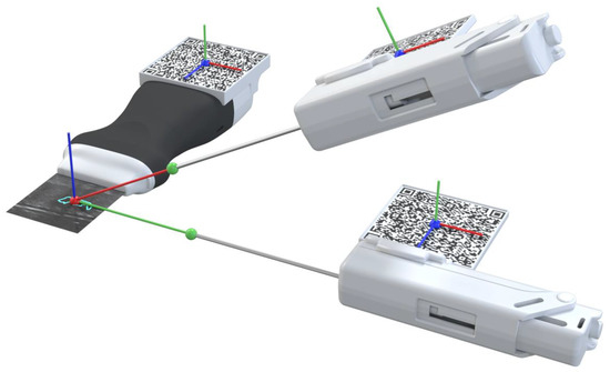 The AR glasses use the QR code markers to track the pose of the needle and the US probe, which allows accurately placing the holograms in the 3D world. To accomplish this, we utilize the real dimensions of the QR codes, which the application knows before the tracking process, as references to estimate the target position and orientation. For it, we use the AR system as the reference coordinate system (i.e., the world), and in real-time, we estimate the transformations and that map the pose of the QR code attached to the ultrasound and needle, respectively, with the world (i.e., the AR system). Once we have these transformations, we compute the pose of the needle and ultrasound tip from the predefined fixed transformations and , respectively. Equations (1) and (2) show these conversions in more detail. Figure 4 depicts a visual representation of this conversion. In both cases, a CAD software was used to precisely measure the required offset between the centroid of the QR code and the device’s tip on the digital models (in STL format) of the US probe and the biopsy needle. The digital probe model was provided directly by the manufacturer. The outer surface of a real biopsy needle was manually designed in SolidWorks by two experienced designers.