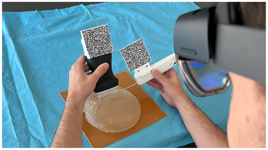Performing the biopsy procedure with the AR glasses (Figure 3) requires the localization of its main components, such as the US image, in the 3D world, along with the relative position of the biopsy needle tip. Therefore, the US probe and the biopsy needle require constant tracking by the AR glasses. The solution to actively track both objects revolved around tracking a physical QR code tag mounted on these objects. This is performed utilizing the Vuforia SDK to recognize QR code images in 3D space. The SDK needs prior information of the QR code image and its real-world size. The SDK uses this information to look for pre-determined features on the QR codes. Custom casings were 3D-printed to house the QR code tags on the US probe and on the biopsy needle. These casings were made of polylactic acid and were printed on the Ultimaker II 3D printer with a printing resolution of 0.2 mm.