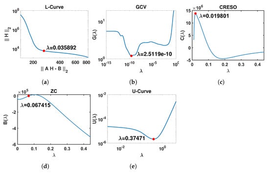 Graphical illustration of the outputs of the five methods included in this study for the estimation of the regularization parameter . The red points represent the optimal value of for each method. In order to present the different curves clearly, only part of the x-axis is shown. (a) L-Curve: log-log plot of the regularized solution norm versus the corresponding residual norm across the full range for . (b) GCV: curve for . (c) CRESO: curve for . (d) ZC: curve for . (e) U-Curve: log-log plot of the curve for .