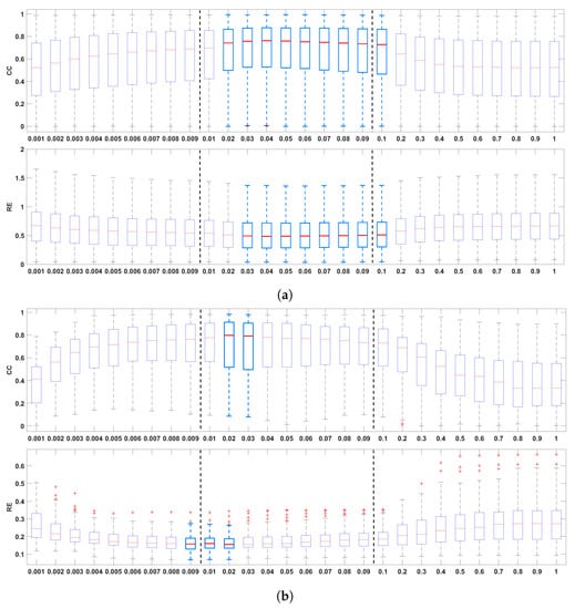 Figure 2 shows the boxplots of the CC and the RE between the recorded and the reconstructed electrograms (two top panels), the measured and reconstructed activation times (two middle panels), and the measured and the reconstructed recovery times (two bottom panels), for all values of in the ranges 0.001–0.009, 0.01–0.09, and 0.1–1.0. In general, it can be noticed that the mid-regularization range provides larger CC and smaller RE values for reconstructed potentials and activation/recovery times. The best results are achieved for [0.02, 0.1], [0.01, 0.03], [0.02, 0.03], respectively (with 0.02 included in all three intervals).