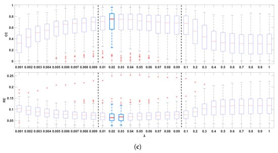 The influence of the regularization parameter on the ECGI inverse solution was analyzed by measuring the CC and the RE for epicardial potentials, activation times, and recovery times, for all values of in the ranges defined in Section 2.2—namely, 0.001–0.009 (low-regularization; step: 0.001), 0.01–0.09 (medium-regularization; step: 0.01), 0.1–1.0 (high-regularization; step: 0.1). For each beat, different time instants can yield different values. Therefore, for the reconstruction of a beat, we used the median from all time instants of that beat (as in [17]).