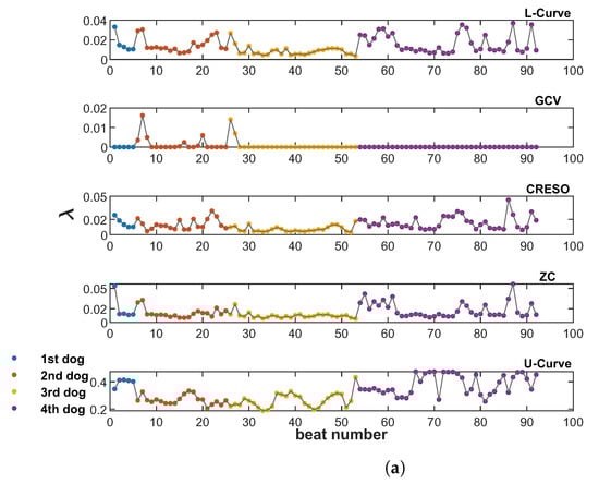 Figure 3 shows the values provided by all five methods analyzed in this study (L-Curve, GCV, CRESO, ZC, and U-Curve), computed on the 92 beats available from the four dogs. Figure 3a shows the scatter plots of values for all beats and each dog, and Figure 3b–f show the corresponding distributions for the different methods. L-Curve, CRESO, and ZC show comparable distributions, with median values around 0.01, which lies in the medium-regularization range. The median for GCV was almost 0, with only two beats yielding a greater than 0.01. The median for the U-Curve was 0.3, thus showing a preference for a higher regularization range.