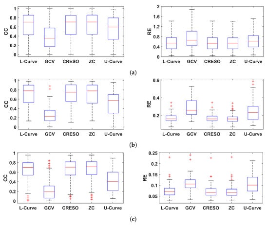 Boxplots summarizing the performance of the five methods for estimating the regularization parameter analyzed in this study. Performance is shown in terms of CC and RE for reconstructed electrograms (a), activation times (b), and recovery times (c).