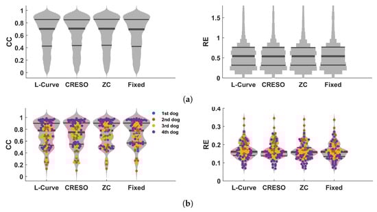 For the five previously discussed methods, before determining the optimal regularization parameter value , a range in which varies should be selected first. This choice of interval for variation has an impact, since these methods for computing the optimal regularization parameter are entirely data-driven and may not return a value for if the interval is too narrow, or an undesirably small if the interval is too wide. In our experiments, the predefined interval is set, by means of the singular values of the transfer matrix A, to be . For the four dogs, the corresponding intervals are , , , and , which appear to work suitably well. The interval for the GCV method is chosen as . For the U-Curve method, the wider interval is used.