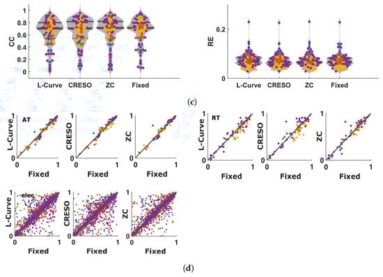 Results summarizing the performance comparison between L-Curve, CRESO, and ZC vs. when using a fixed value of for all 92 beats used in this study. (a): Violin plots of CC (left) and RE (right) between measured and reconstructed electrograms for L-Curve, CRESO, ZC, and when using a fixed value of for all 92 beats. Only the distributions are provided in this plot, because of the large amount of time instants considered for the electrograms (5488). (b): Violin plots of CC (left) and RE (right) between measured and reconstructed activation times for L-Curve, CRESO, ZC, and when using a fixed value of for all 92 beats. (c): Violin plots of CC (left) and RE (right) between measured and reconstructed recovery times for L-Curve, CRESO, ZC, and when using a fixed value of for all 92 beats. (d): Upper-left: relation between activation times (AT) estimated with either L-Curve, CRESO, or ZC vs. when using a fixed value of . Upper-right: similar, but for recovery times (RT). Lower-left: similar, but for electrograms.